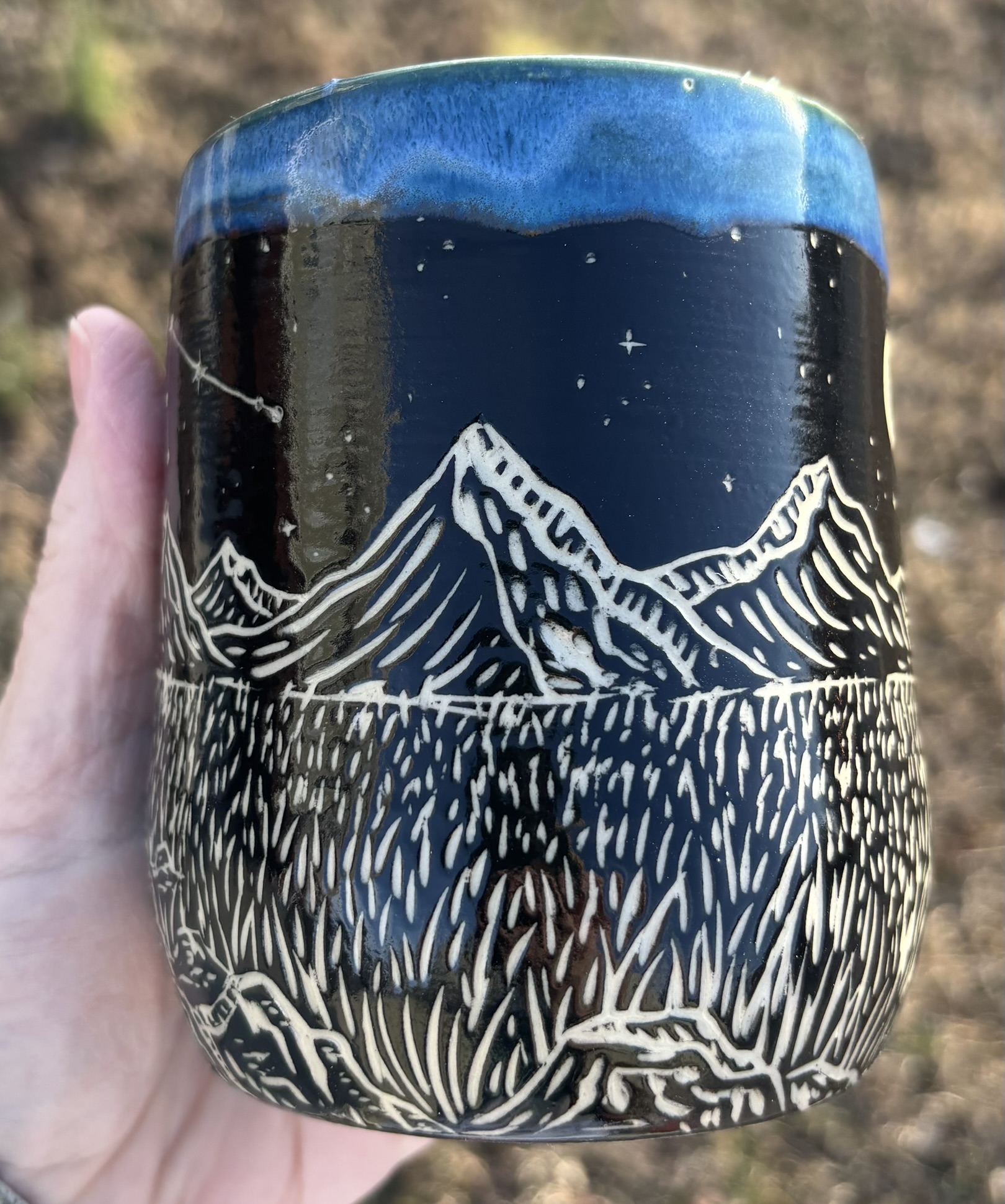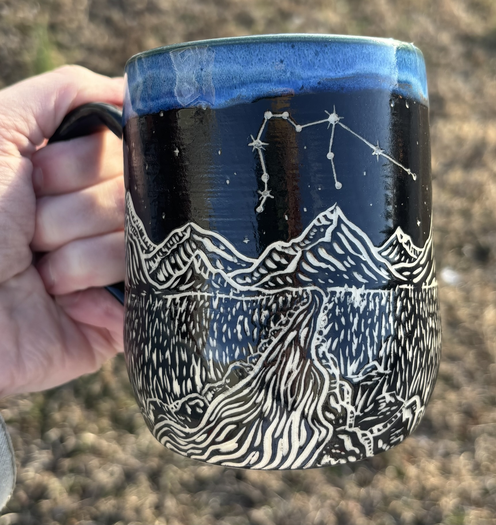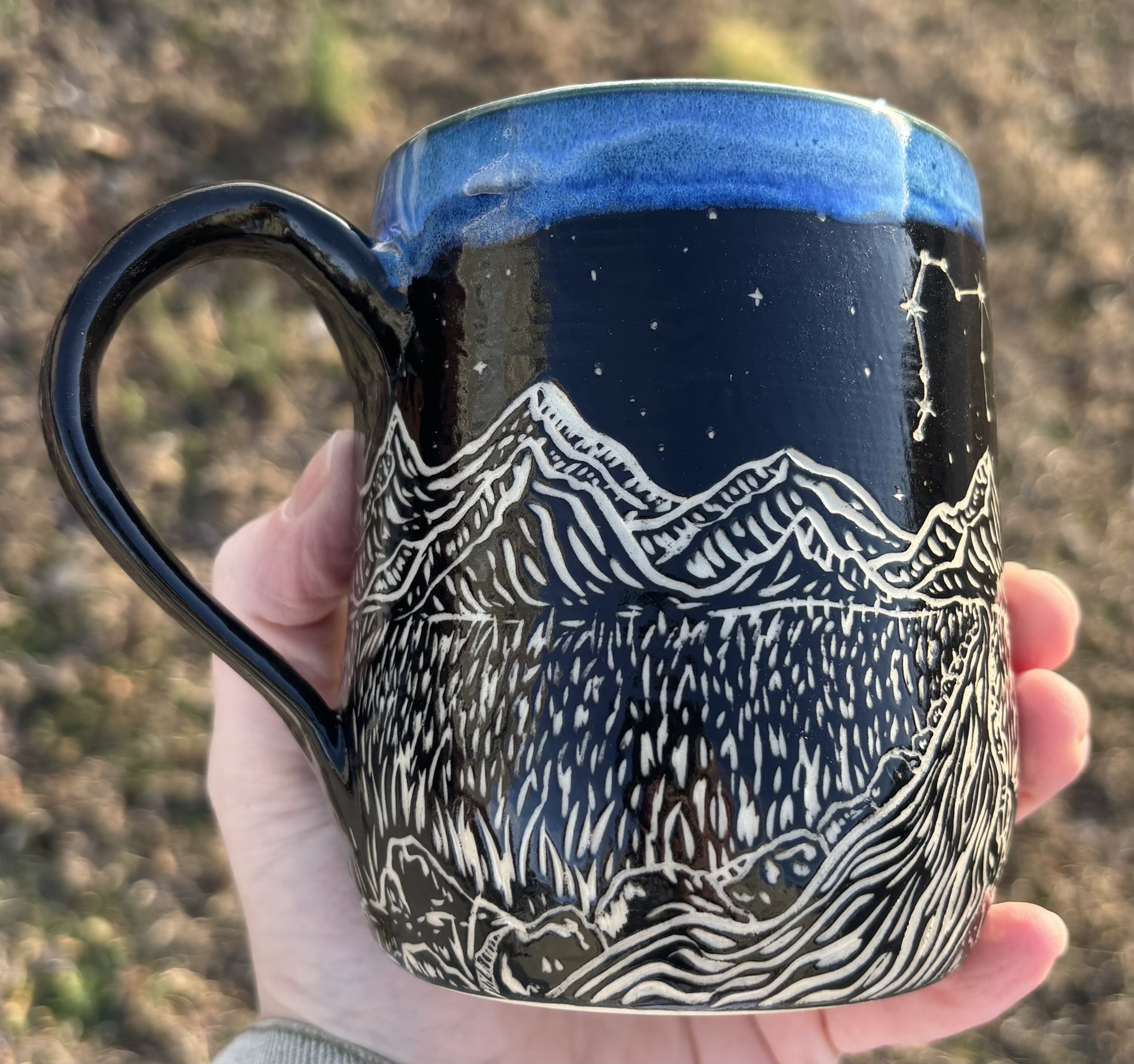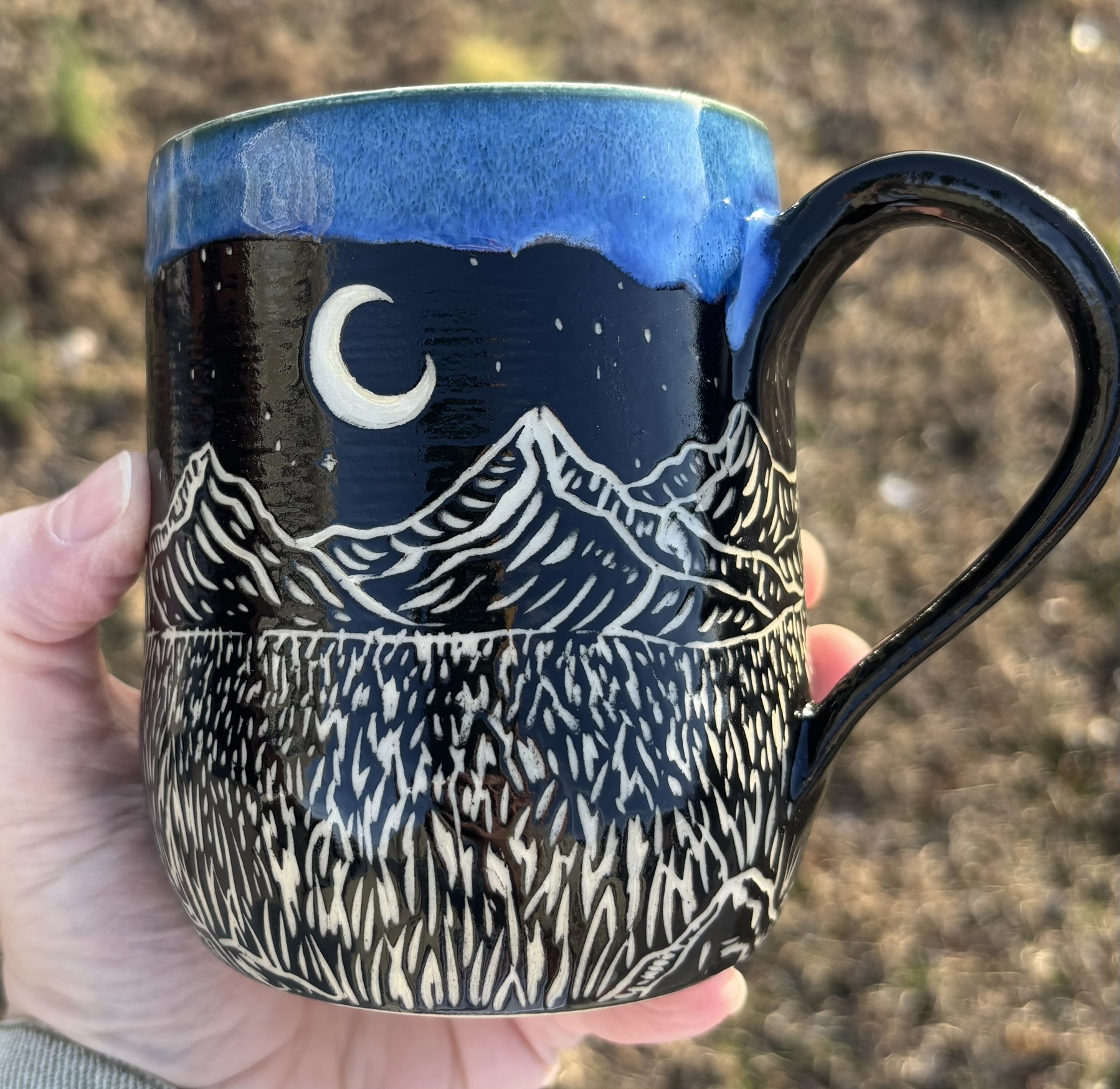 Someone buy this so that I can make an entire zodiac/mountain/great outdoors sgraffito line, PLZ! White stoneware mug with sgraffito mountains, rocks, plains, a lil’ river, a crescent moon, and the water bearer constellation in the sky! Dishwasher & microwave safe, although I like to handwash my special pieces – just to be safe!