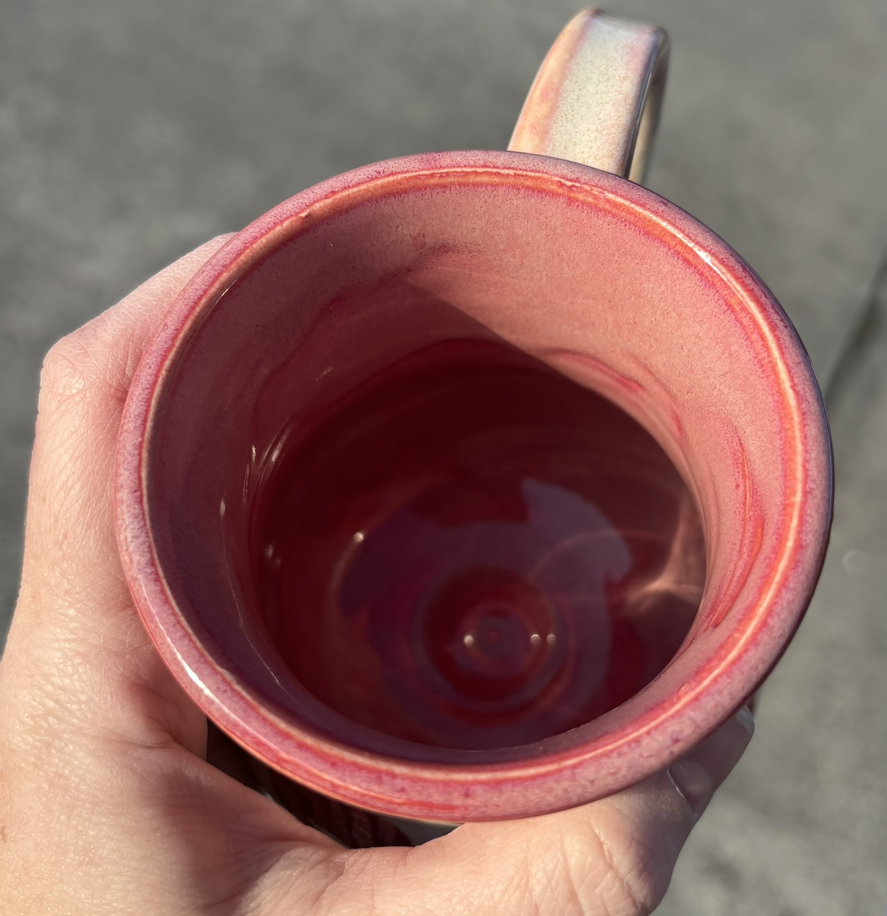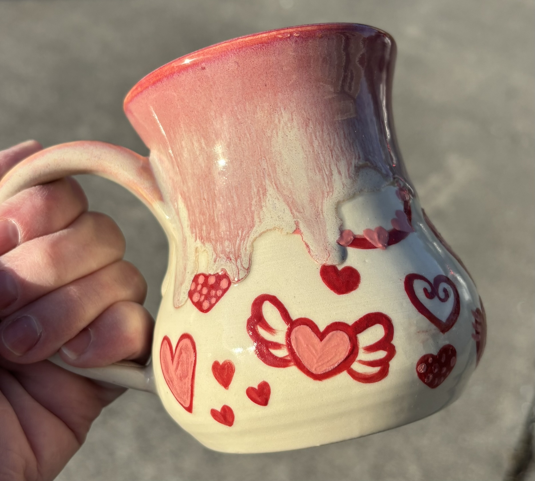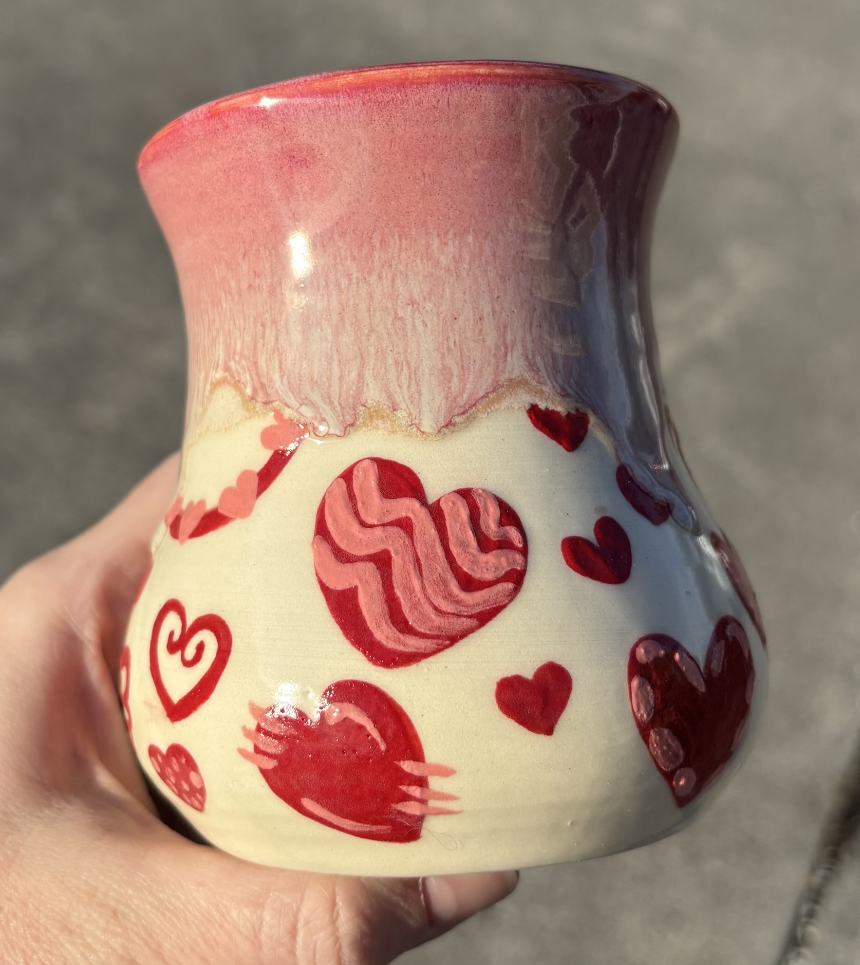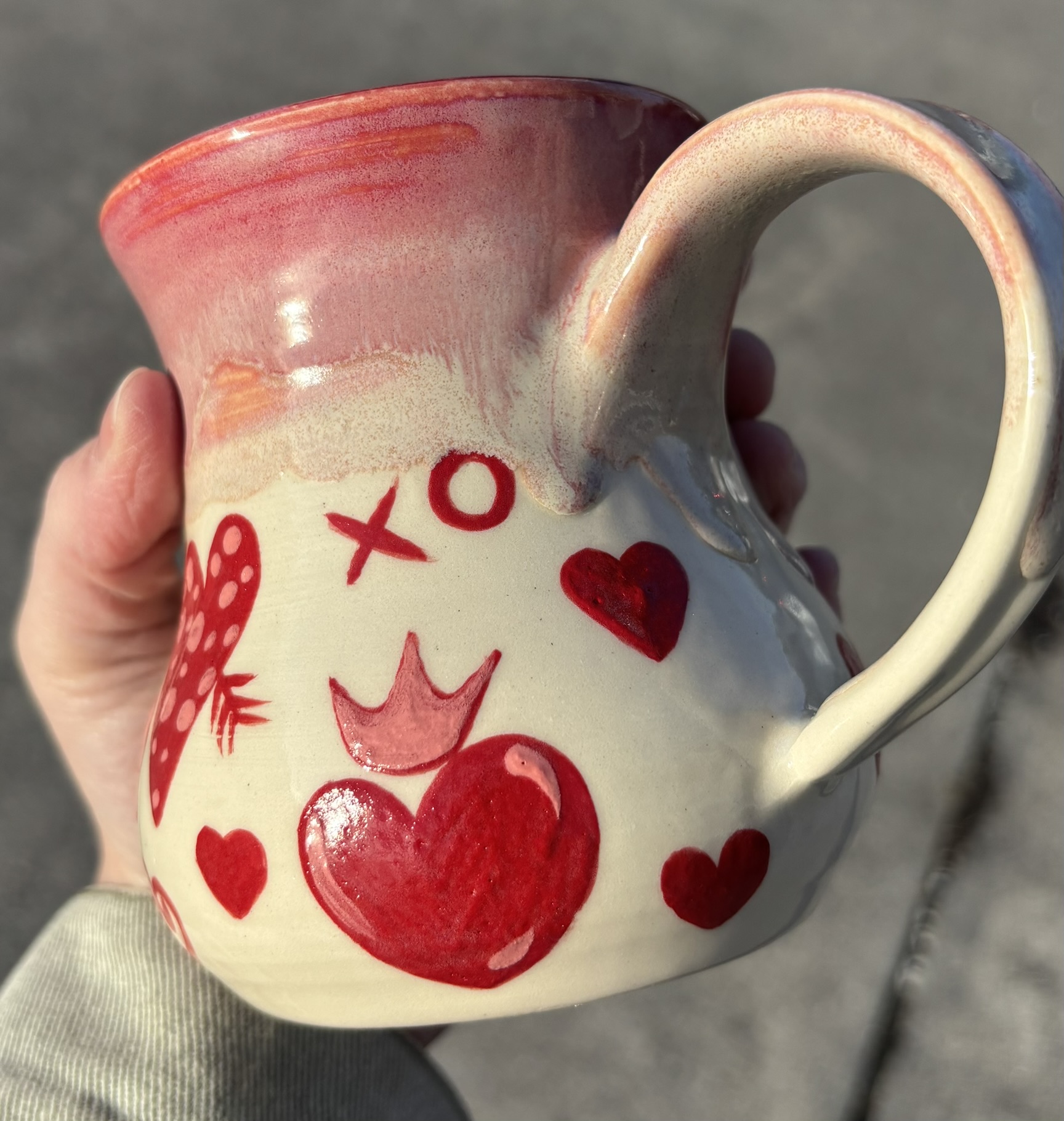 White stoneware mug with painted on valentine’s doodles and a groovy pink rim! Dishwasher & microwave safe, although I like to handwash my special pieces – just to be safe!