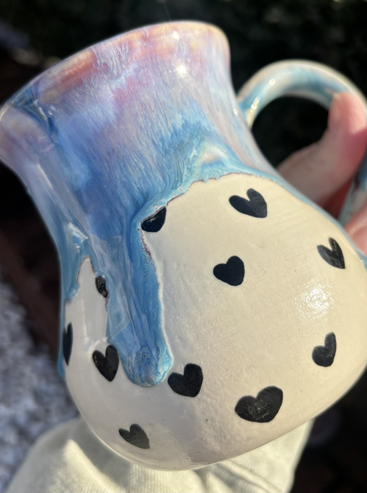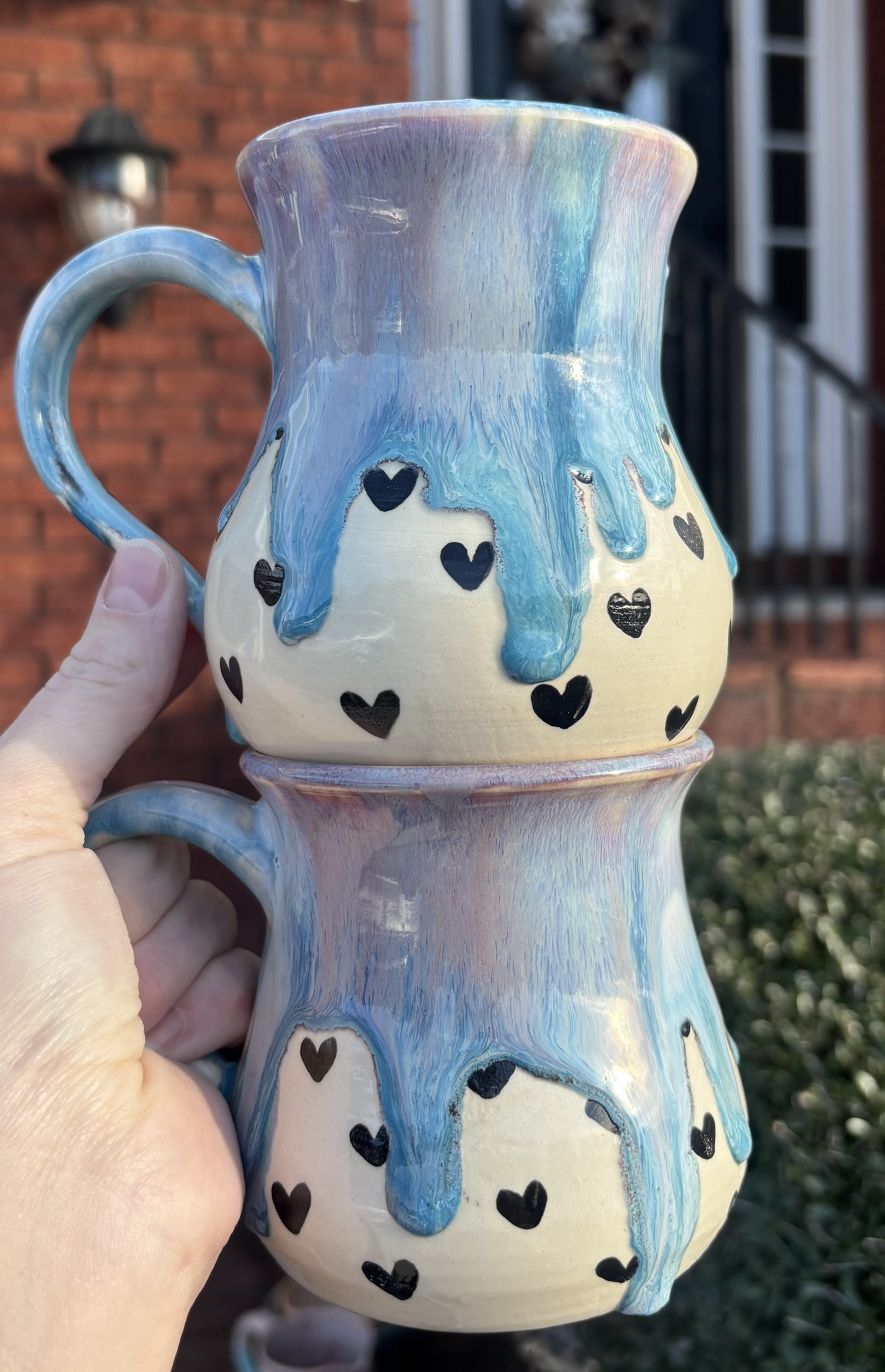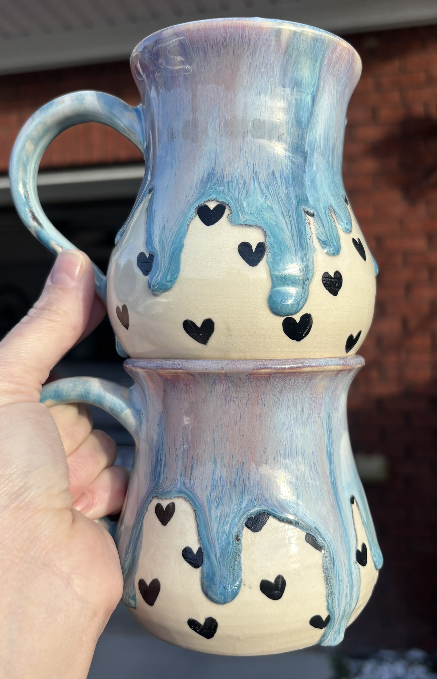 Honestly I’m not selling them so that you HAVE to do this, but I would 11920382091% buy these two together for a set. They look SO GOOD that way, ugh. Anyway, white stoneware mug with painted on underglaze hearts and a SUPER PRETTY drippy teal/purple rim! Dishwasher & microwave safe, although I like to handwash my special pieces – just to be safe!