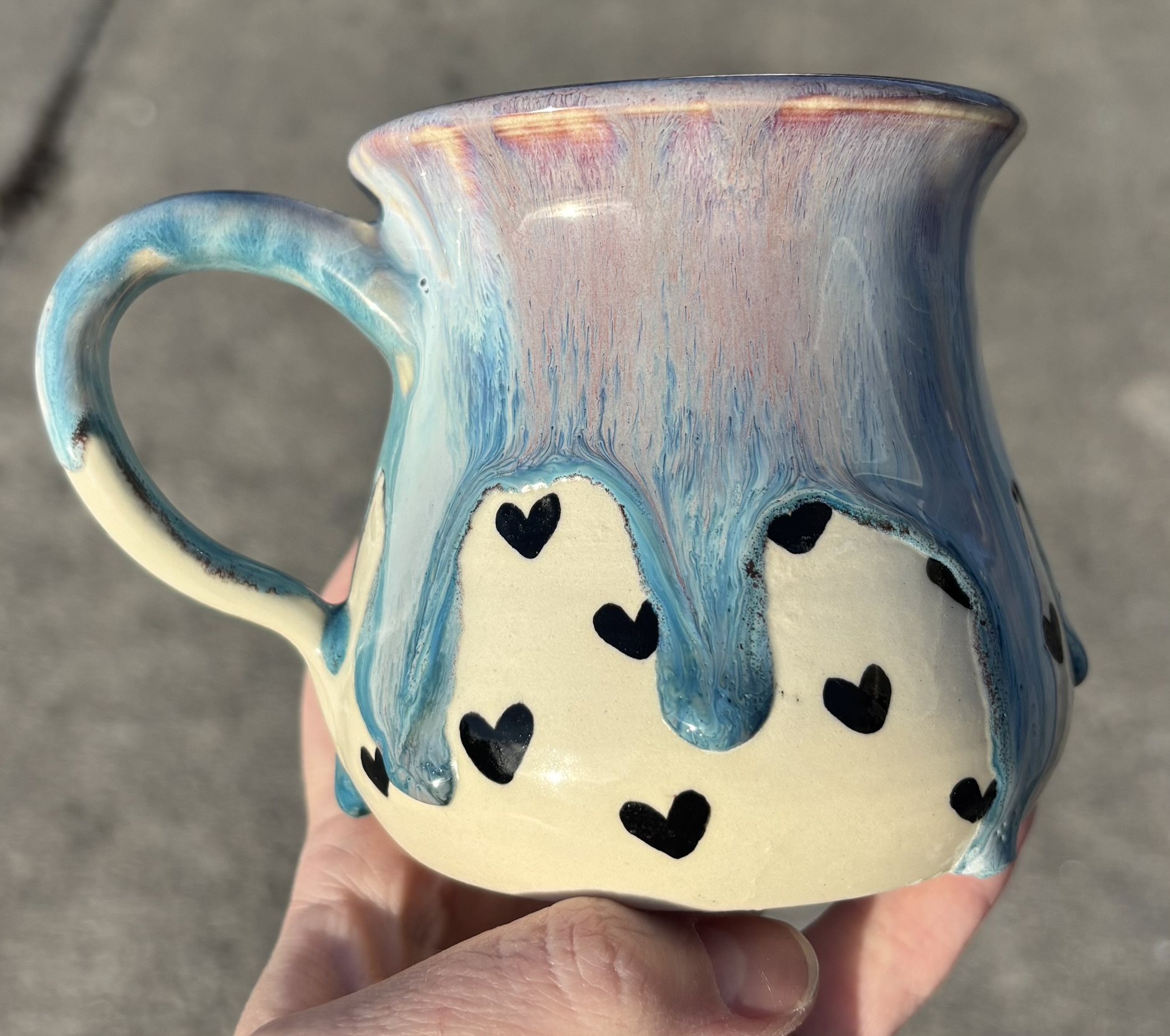 Honestly I’m not selling them so that you HAVE to do this, but I would 11920382091% buy these two together for a set. They look SO GOOD that way, ugh. Anyway, white stoneware mug with painted on underglaze hearts and a SUPER PRETTY drippy teal/purple rim! Dishwasher & microwave safe, although I like to handwash my special pieces – just to be safe!