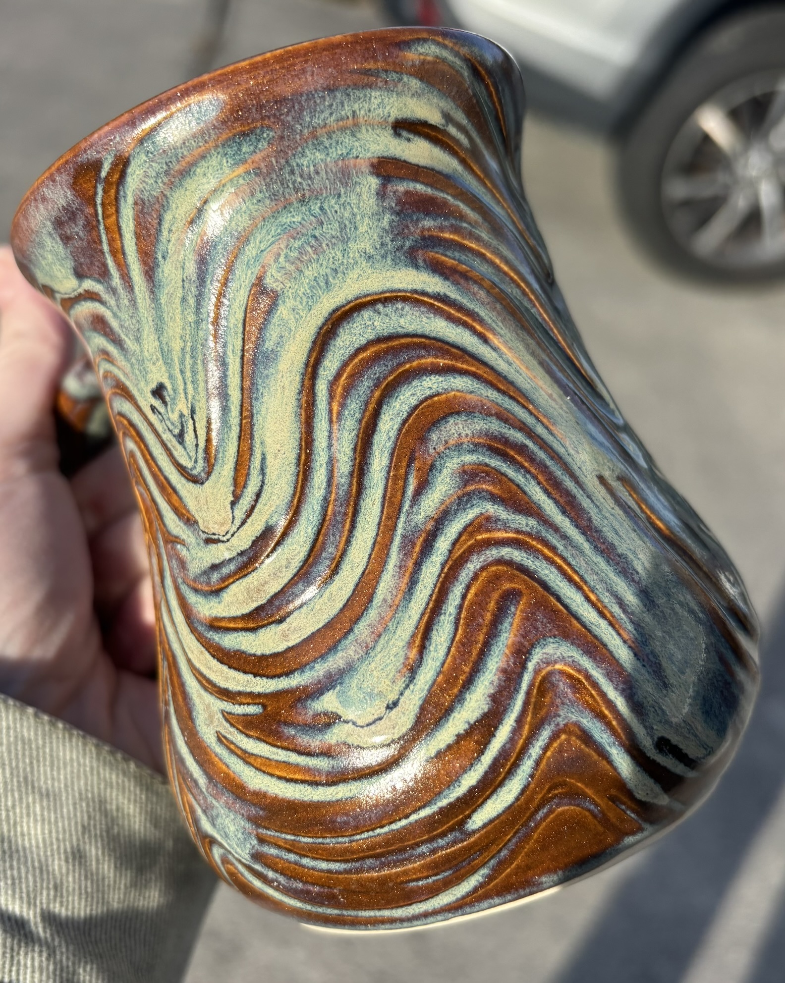 White stoneware mug with carvings – I like to think of them as topographical lines, when I carve them 🙂 and a new glaze!!! It’s brown and blue and green all at once, somehow. I LOVE it. Dishwasher & microwave safe, although I like to handwash my special pieces – just to be safe!