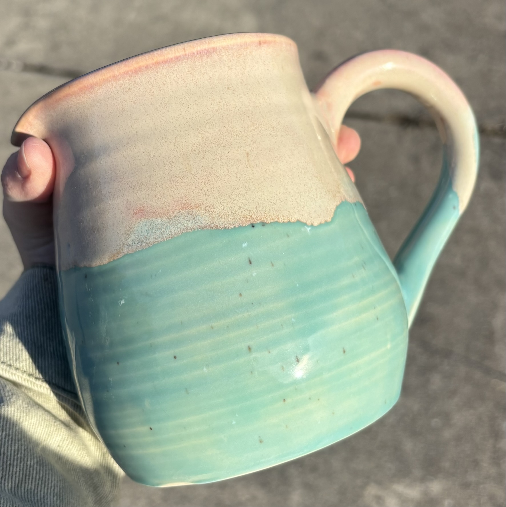 One of the few pitchers that actually survived the glaze firing, haha! Glazed like a summer watermelon – light pinky orange and a cool glassy turquoise! This guy is great for holding sangria, lemonade, flowers, lego flowers, poison for your enemies…I’m not gonna judge you, friends. Dishwasher & microwave safe, although I like to handwash my special pieces – just to be safe!
